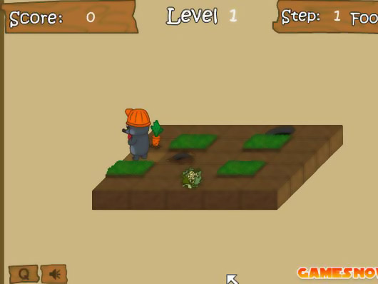 Эта игра не имеет ничего общего с охотой на крота. Это головоломка, в которой вы должны помочь кроту собрать все овощи в уровне и пробраться к выходу. На каждом ходу вы можете перемещать крота на одну из свободных смежных ячеек с помощью соответствующей стрелки управления. Одно важное условие - чтобы пройти уровень вы не должны дважды ступить на одну и ту же ячейку. Если это произойдет - уровень начнется сначала.
